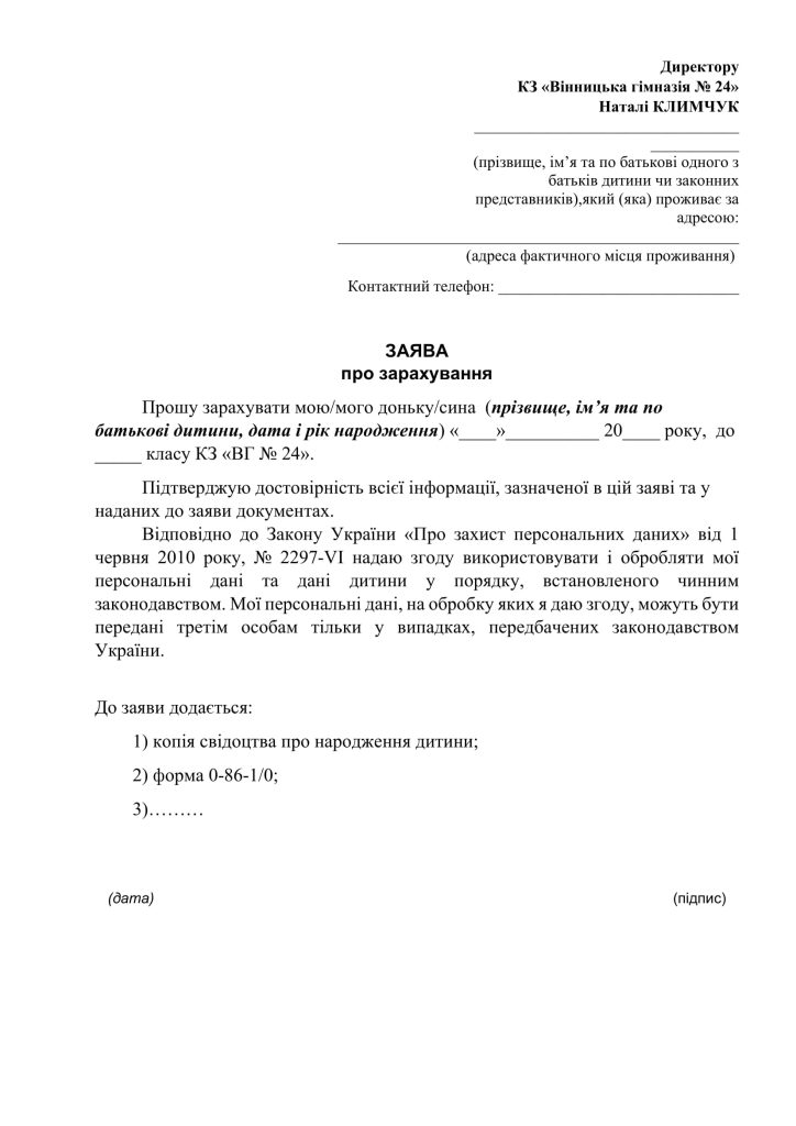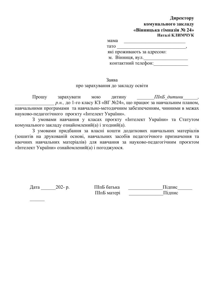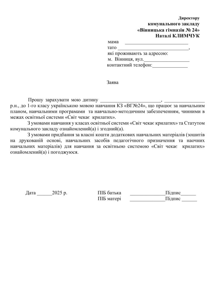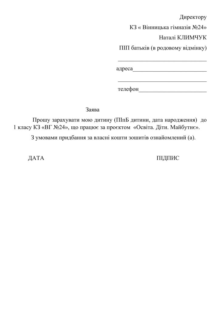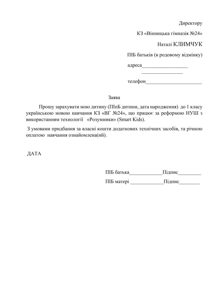 6. Заповнити заяву. Прохання попередньо ознайомитись на сайті школи зі Статутом школи, про що буде зазначено у заяві.