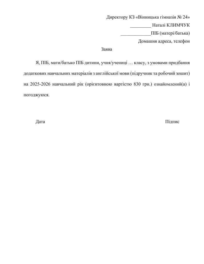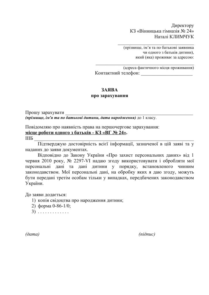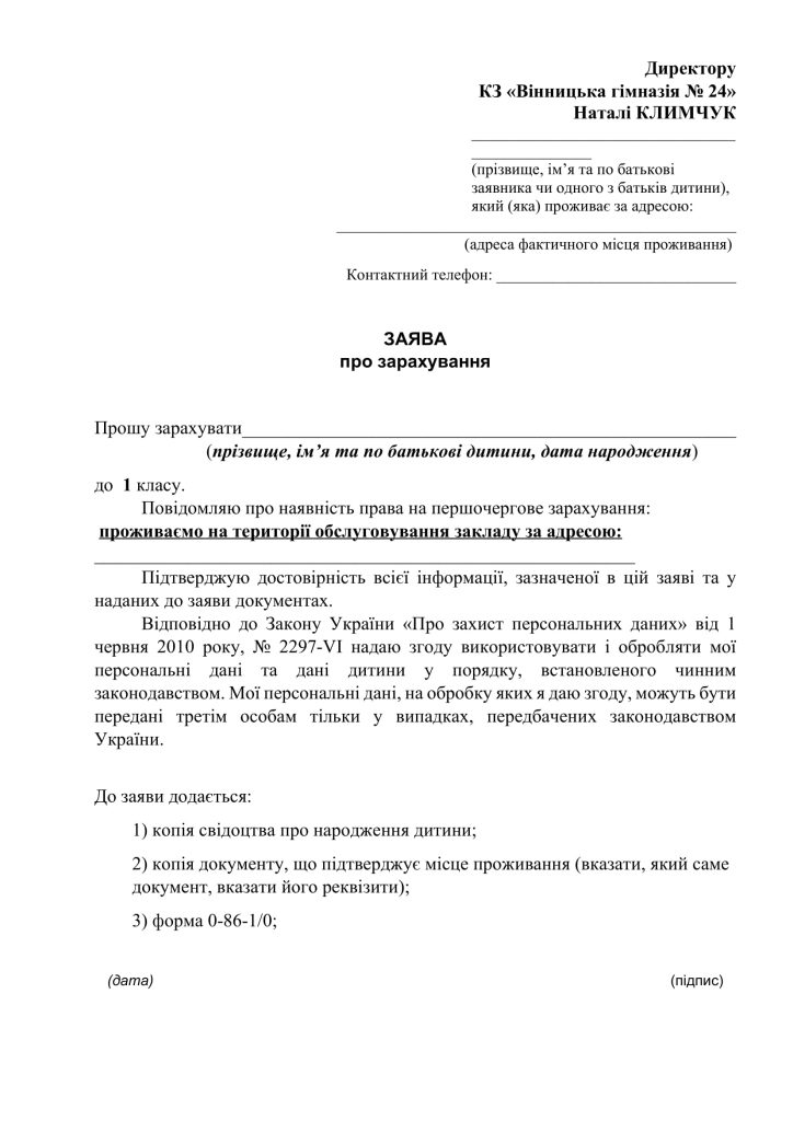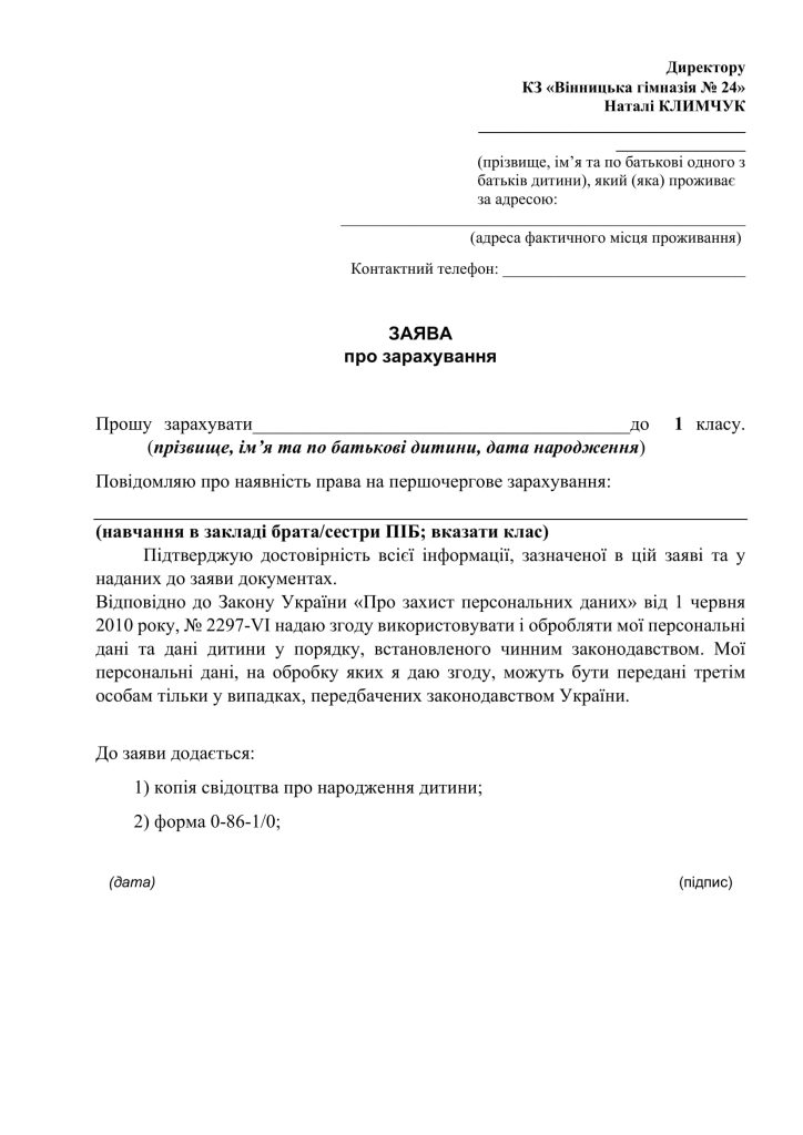 6. Заповнити заяву. Прохання попередньо ознайомитись на сайті школи зі Статутом школи, про що буде зазначено у заяві.